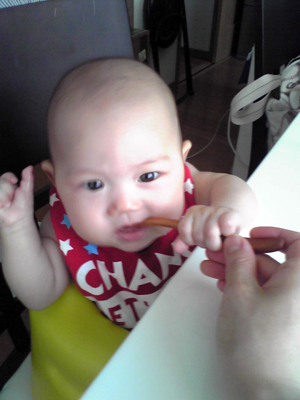 お盆が明けたら離乳食デビューをさせようと思っていますので、練習の意味も兼ねてスプーンを使って水飲み。ちょっと嫌そうです。