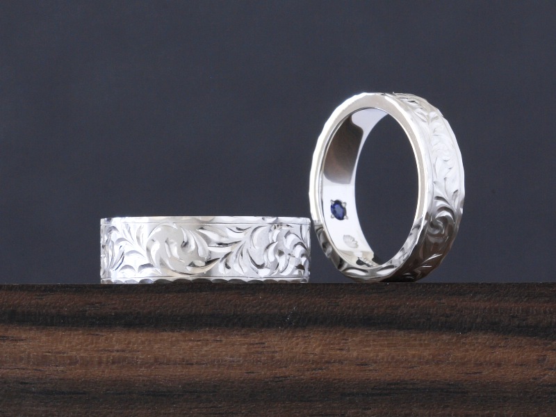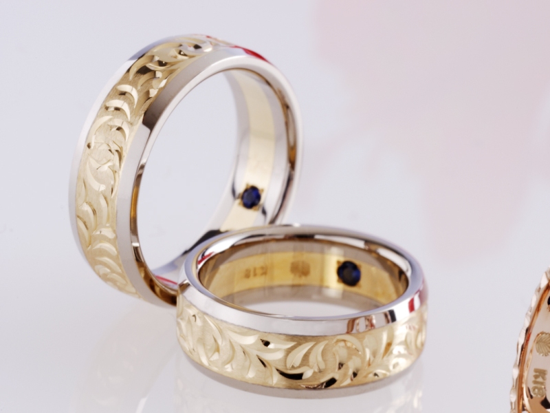 140年の伝統を持つハワイ手彫りの技と、素材を生かし洗練されたクオリティが特長。素材は18K・プラチナを使用し、製造は鍛造・切削・圧着といった最先端技術だそうです。手のひらに置いてみると、けっこう重厚感があります。しかし、実際に指に着けてみると指どおりも滑らかでごわつかず、いい感じでした