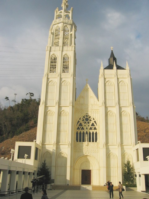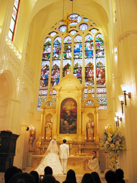 真っ白い大聖堂は外観も迫力ありますが、中に入ると巨大なステンドグラスが天井まで伸びていて、圧倒されました・・・幅6m、高さ10mだそうです!この日は模擬挙式もあり、イメージ膨らみました!
