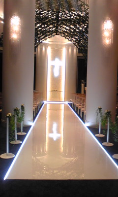 携帯で撮影したため、雰囲気が分かってもらいづらいかもしれないですが、柔らかなスワロフスキーの光、あふれる緑、そしてチャペルを包み込む水の流れ。。。全てがカップルに微笑みかけてくれます。