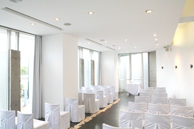 ふたり色に染めて欲しい・・・そんな願いが込められた会場は、四季の景観が楽しめるようにと、大きなガラス窓が・・・。そこからの眺め、入り込むあたたかな日差しが、ふたりだけでなく、ゲストも包み込んでくれます。ホテルでありながら、そして街中であることを忘れさせてくれる雰囲気は、きっと今までにないウェディングのカタチを教えてくれるはずです。
