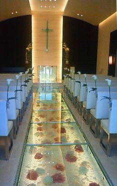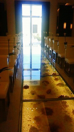 ガラスのバージンロードに扉の先のガラスの壁の模様が映って、