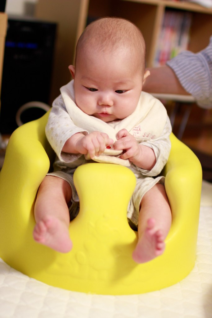 その成長を待ちきれない我々夫婦。首も十分座っていないのに「バンボ」に座らせてみたのですが…。やはり首が安定せず。まだちょっと早かった…。