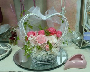 これはプリザーブドフラワーといって、生のお花を特殊加工して半永久的に楽しめるアレンジなんです