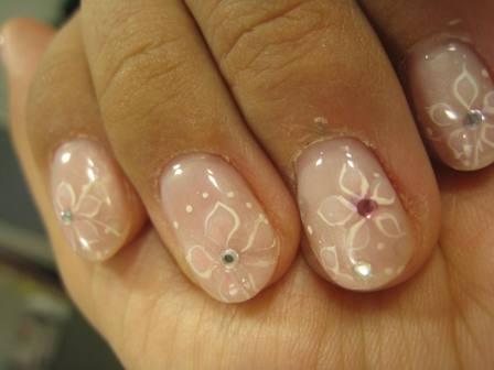 クリアなジェルネイルをベースにピンクを重ね、お花を描いてもらっています。